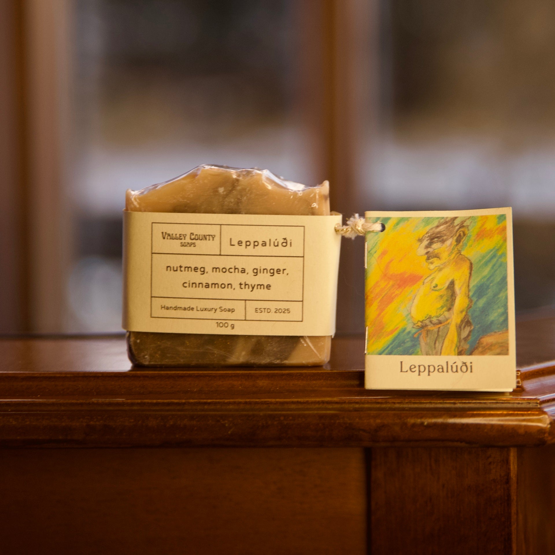 Með sápunni fylgir hefti á ensku sem inniheldur fróðleiksmola um Leppalúða og er það myndskreytt með listaverkum frá íslenskum listamanni.